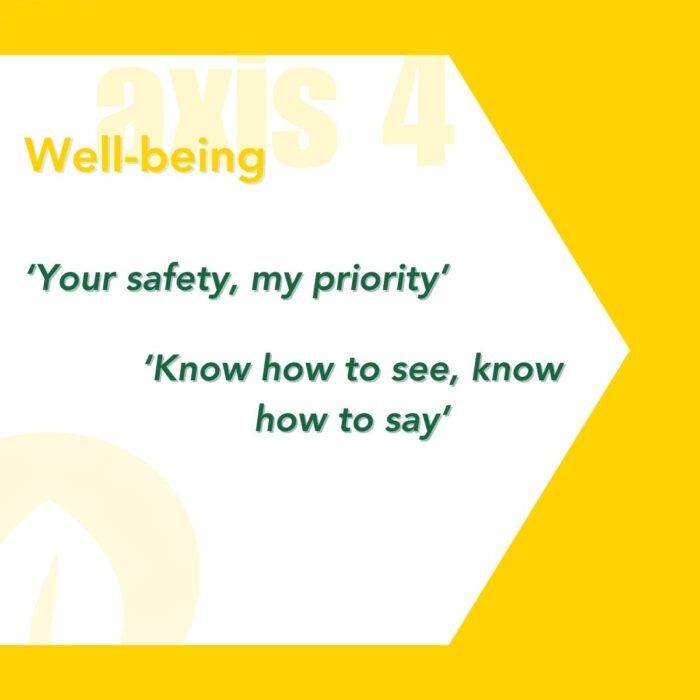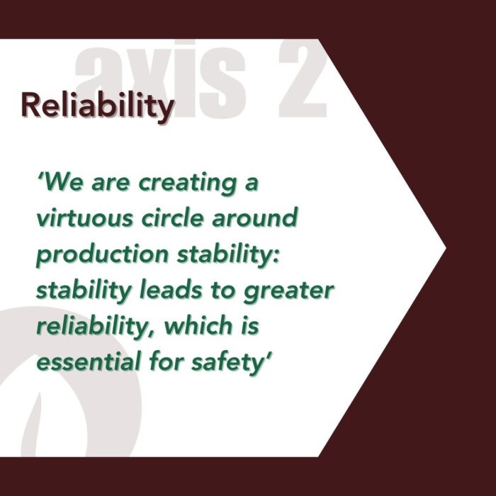 - Axis 1: Preventing risks and continuously improving safety – with regular sharing of experience and best practice, discipline in applying the golden rules of safety and life-saving procedures, safety governance at each site, etc.